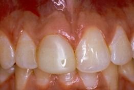 Before: Front (left) Central tooth has a poor restoration. Does not look natural and is not contoured properly to match the gumline of the rest of the teeth.